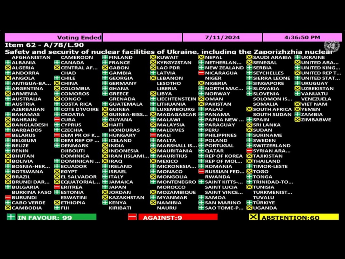 Генеральная ассамблея ООН 11 июля 2024 приняла резолюцию A/78/L.90, которая называется «Техническая и физическая безопасность ядерных объектов Украины, включая Запорожскую атомную электростанцию», призывающую Россию прекратить агрессию против Украины и вывести свои вооруженные силы из ее территории. Требуется также вернуть контроль над Запорожской атомной электростанцией Украине для обеспечения ее безопасности. России также поручено убрать минные поля […]