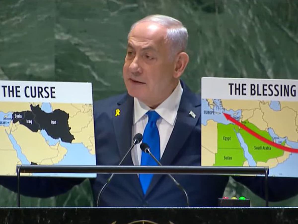 בנאומו השתמש נתניהו במטאפורה של שני קלפים: “קלף הברכה” ו”קלף הקללה”. הראשון מסמל שלום ושגשוג כשישראל בונה שותפויות עם מדינות ערב, בונה מסדרון יבשתי מאסיה לאירופה, מבטיח פיתוח וביטחון יציבים. המפה השנייה מייצגת את “קשת הטרור” שיצרה איראן, הפצת טרור וכאוס ברחבי המזרח התיכון ומאיימת על שלום העולם. נתניהו אמר כי הבחירה בין הקלפים הללו הרת גורל לאנושות כולה.