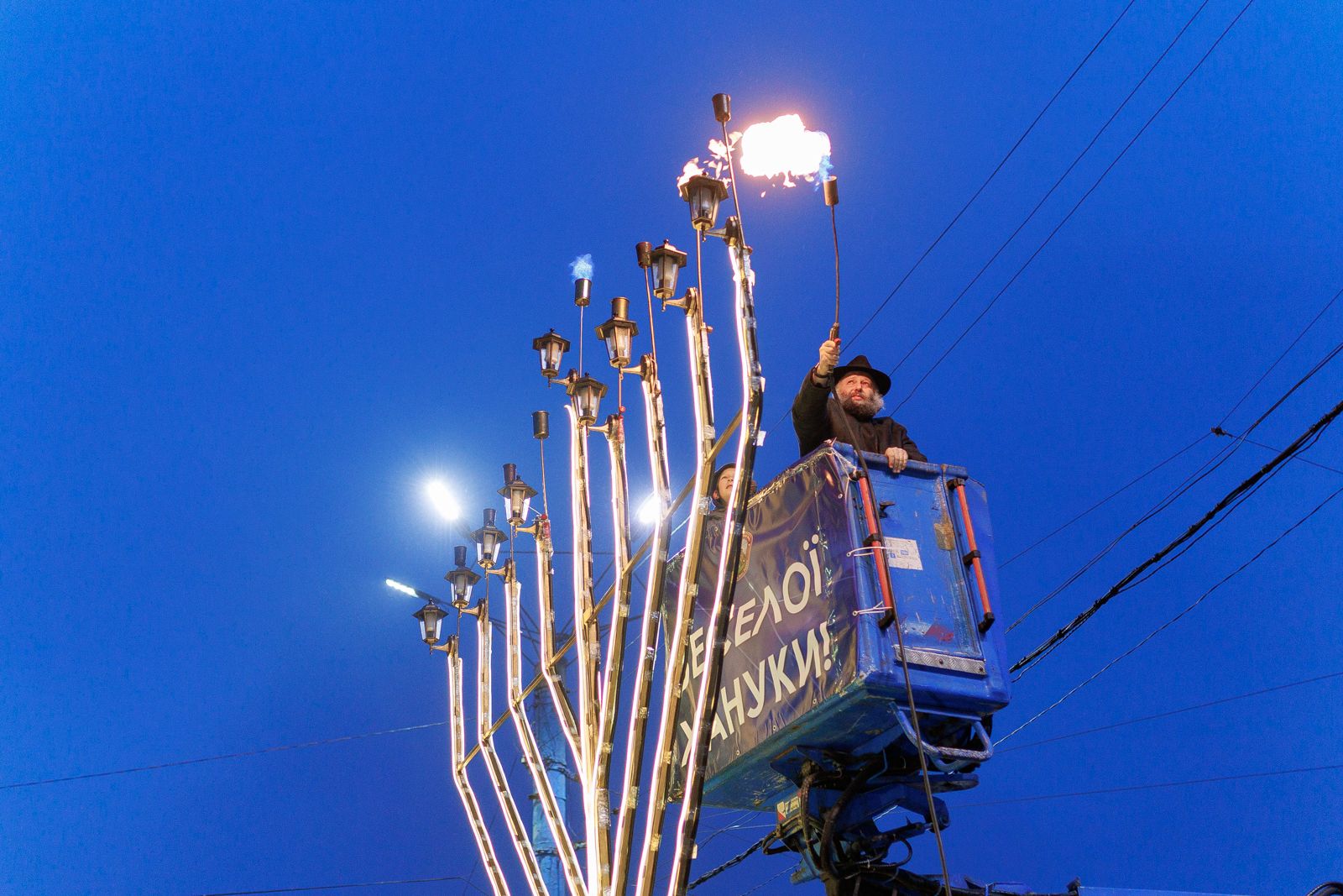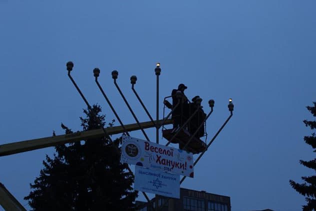 7 декабря в Бердичеве (Житомирская область) на Центральной площади провели первый день иудейского праздника Хануки. Его особый символ – воспаление ритуального девятиподсвечника, увеличивая ежедневно количество свечей в нем. Традиционно 11 год на площади зажигают огоньки на большой церемониальной ханукии. Вчера вечером взвился первый. Проводил церемонию главный раввин Бердичева Моше Талер. После всех обращений Моше Талер и Сергей Орлюк с помощью спецтехники поднялись к самой вершине ритуальной ханукии. Главный раввин зачитал молитву и вместе с городским головой зажег первый огонек. В конце мероприятия собравшиеся сделали общее фото. После этого иудейская община угостила толпу традиционными пончиками жареными в масле.