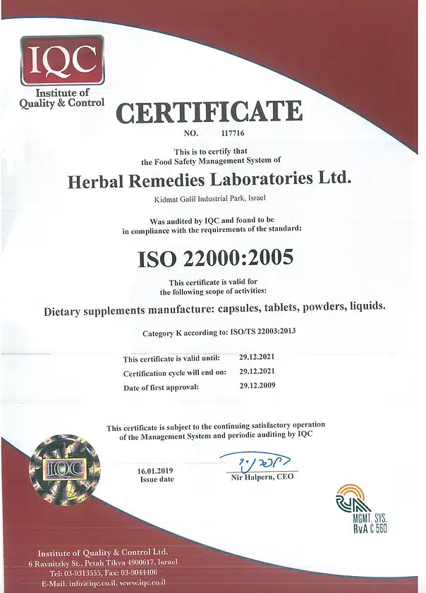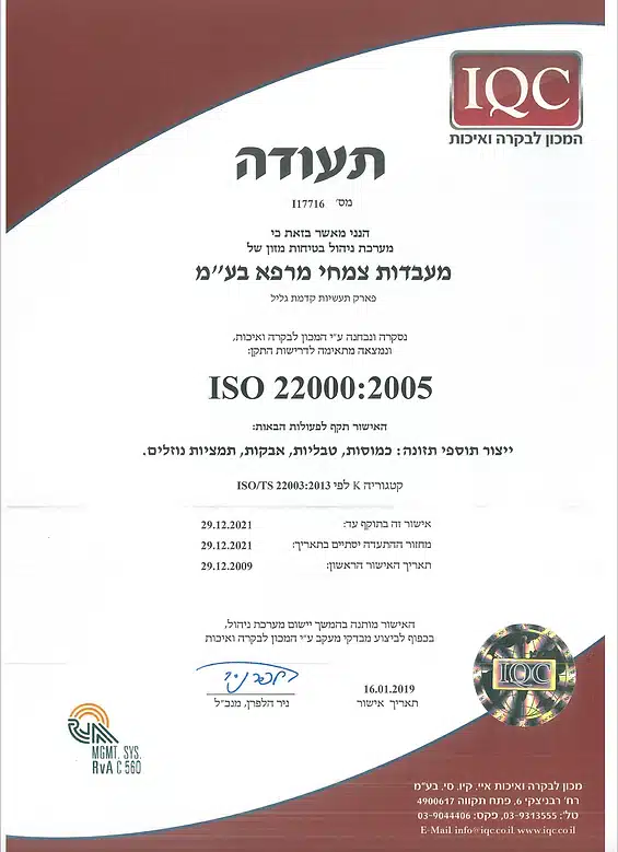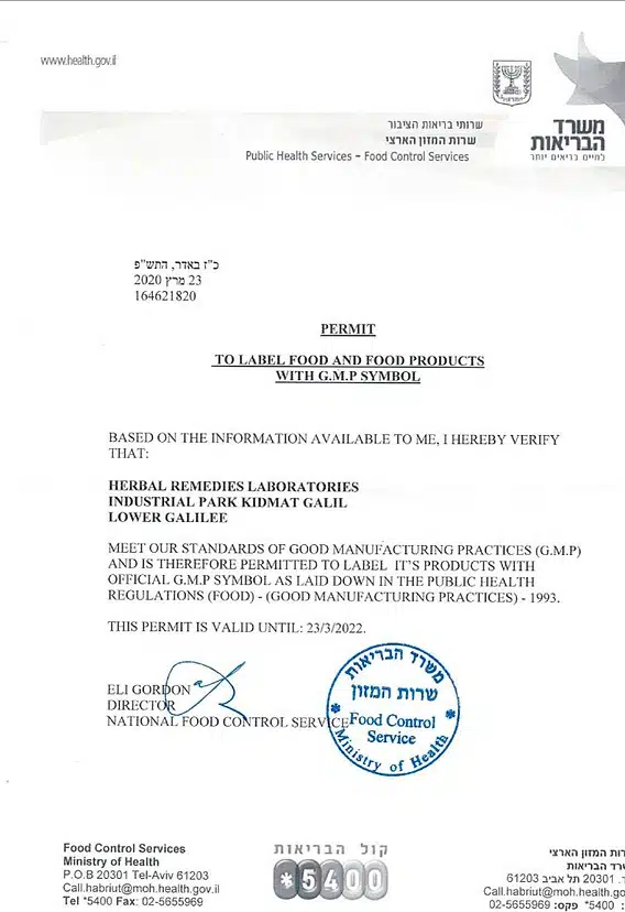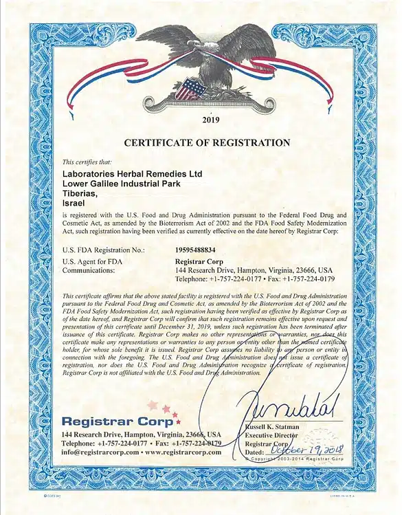 Производство продукции, имеет всю необходимую сертификацию, как израильскую так и международную, включая GMP от министерство здравоохранения Израиля и Американского FDA.