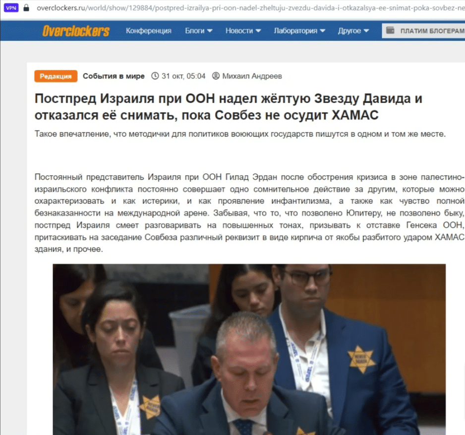 Напомним, после того как Россия и Китай наложили вето на американскую резолюцию по израильско-палестинскому конфликту, дипломаты Израиля в ООН надели желтые звезды, пообещав носить их, пока Совбез ООН не осудит ХАМАС за расправу над евреями.
