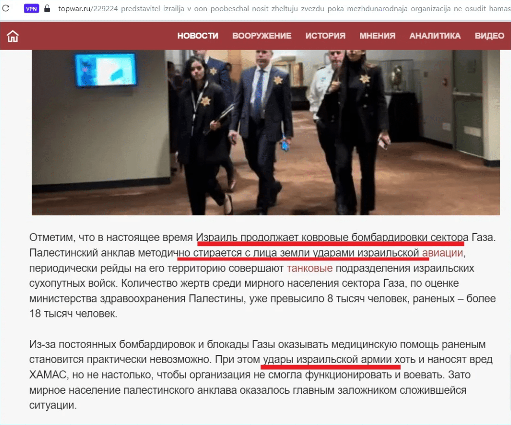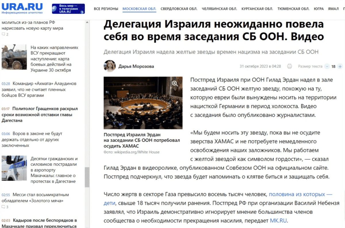 Также можно обратить внимание, что российские массмедиа, комментируя новость об акции Иерусалима с желтыми звездами, тут же пишут, что «в настоящее время Израиль продолжает ковровые бомбардировки сектора Газа». Палестинский анклав методично стирается с лица земли ударами израильской авиации». При этом россияне продолжают распространять фейки и об ударе по больнице в Газе, хотя боевики ХАМАС не предоставили никаких доказательств, что это сделала Армия обороны Израиля. Мало того, в Сети появляются доказательства, что сами же террористы ХАМАС попали по больнице, но российская пресса их обходит стороной, продолжая симпатизировать давним врагам Иерусалима.